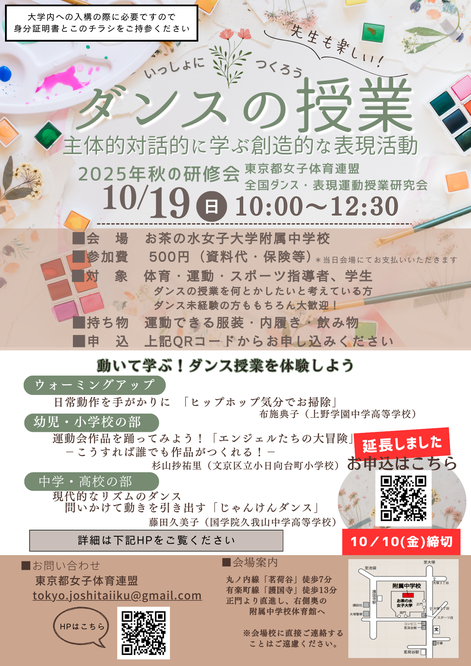 10月の例会は10/19の東京都女子体育連盟との共催研修会になります。皆さん、申し込み必須です。月例会員の参加費は授業研会計から支払います。